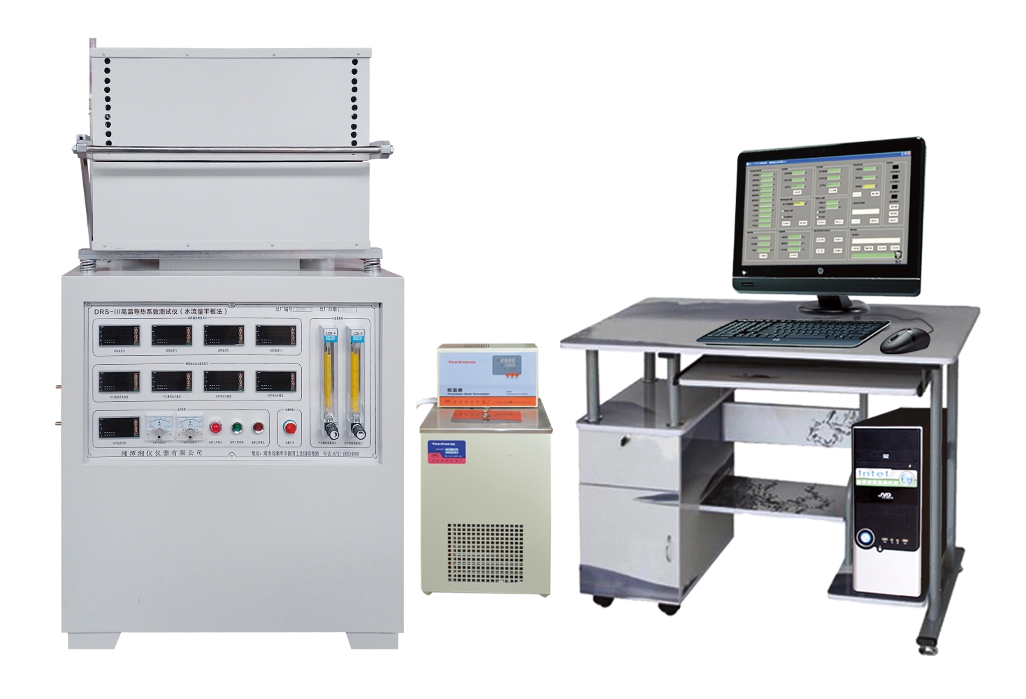 本測(cè)試儀基于YB/T 4130《耐火材料 導(dǎo)熱系數(shù)試驗(yàn)方法(水流量平板法)》測(cè)試標(biāo)準(zhǔn),參照標(biāo)準(zhǔn)的要求,設(shè)備主要由加熱爐、電腦測(cè)控系統(tǒng)、恒壓循環(huán)水系統(tǒng)、量熱器系統(tǒng)等部分構(gòu)成。